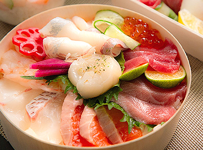 「とんかつ丸七」の敷地内に併設された、海鮮丼・海鮮弁当のテイクアウト専門店です。築地の人気店「築地やまの」が監修し、地元・宇和海近海などで獲れた魚介をふんだんに使用。特許取得の処理技術によって旨みを引き出し、臭みのない上品な味わいに仕上げています。