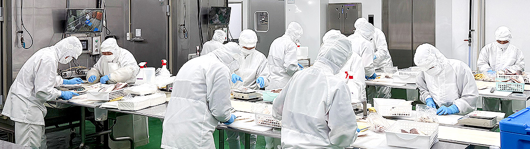 SakuSakuは、養殖魚(ブリ・真鯛・ハマチなど)を、活魚同様の鮮度を保ちながら「スライス切り身」へ仕上げる加工に力を注いでいます。オンスイ独自の特許技術「超冷薫」で凍結された魚を、半解凍の絶妙な状態で一枚一枚丁寧にスライス。魚は「切り方ひとつ」で食感も味わいが変わります。厚みや角度にこだわることで、噛んだ瞬間の心地よさや旨みの広がりがまったく違うものになるのです。